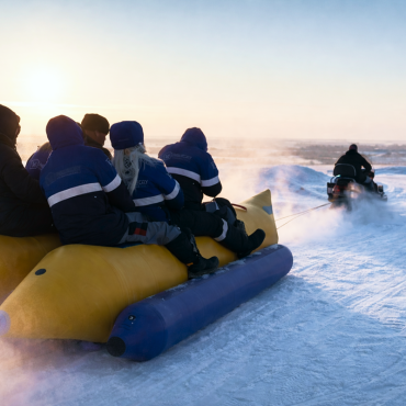 Зимой гости катаются на тюбингах с подъёмником, снегоходах и «банане», а после возвращаются в тёплый домик или баню, чтобы по-настоящему расслабиться.