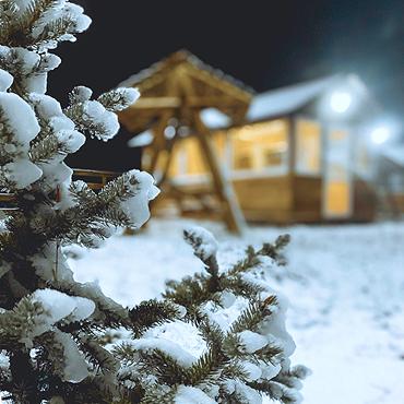 Уютные домики, баня и зимние активности — тюбинги, снегоходы и «банан» среди леса и гор.